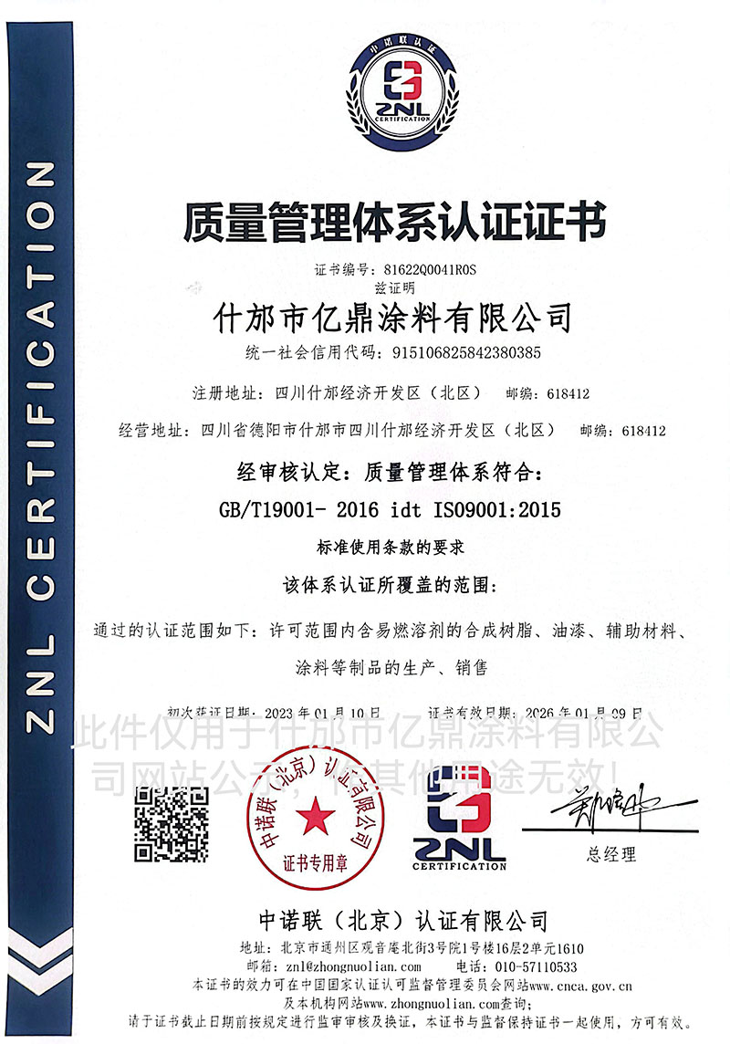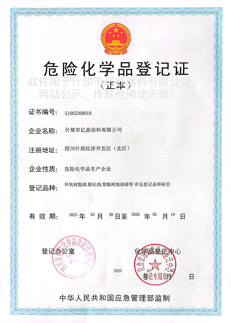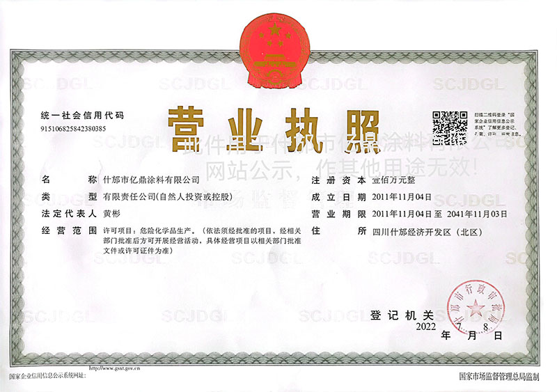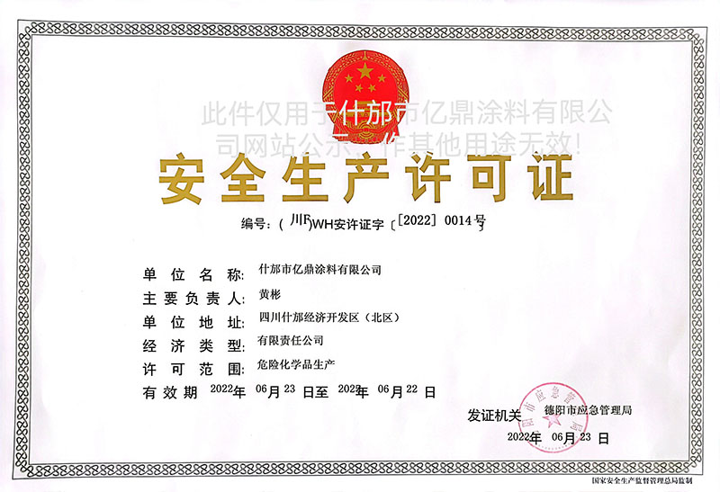 什邡市億鼎涂料有限公司營(yíng)業(yè)執照、安全生產(chǎn)許可證、危險化學(xué)品登記證、質(zhì)量管理體系認證證書(shū)公示如下:
